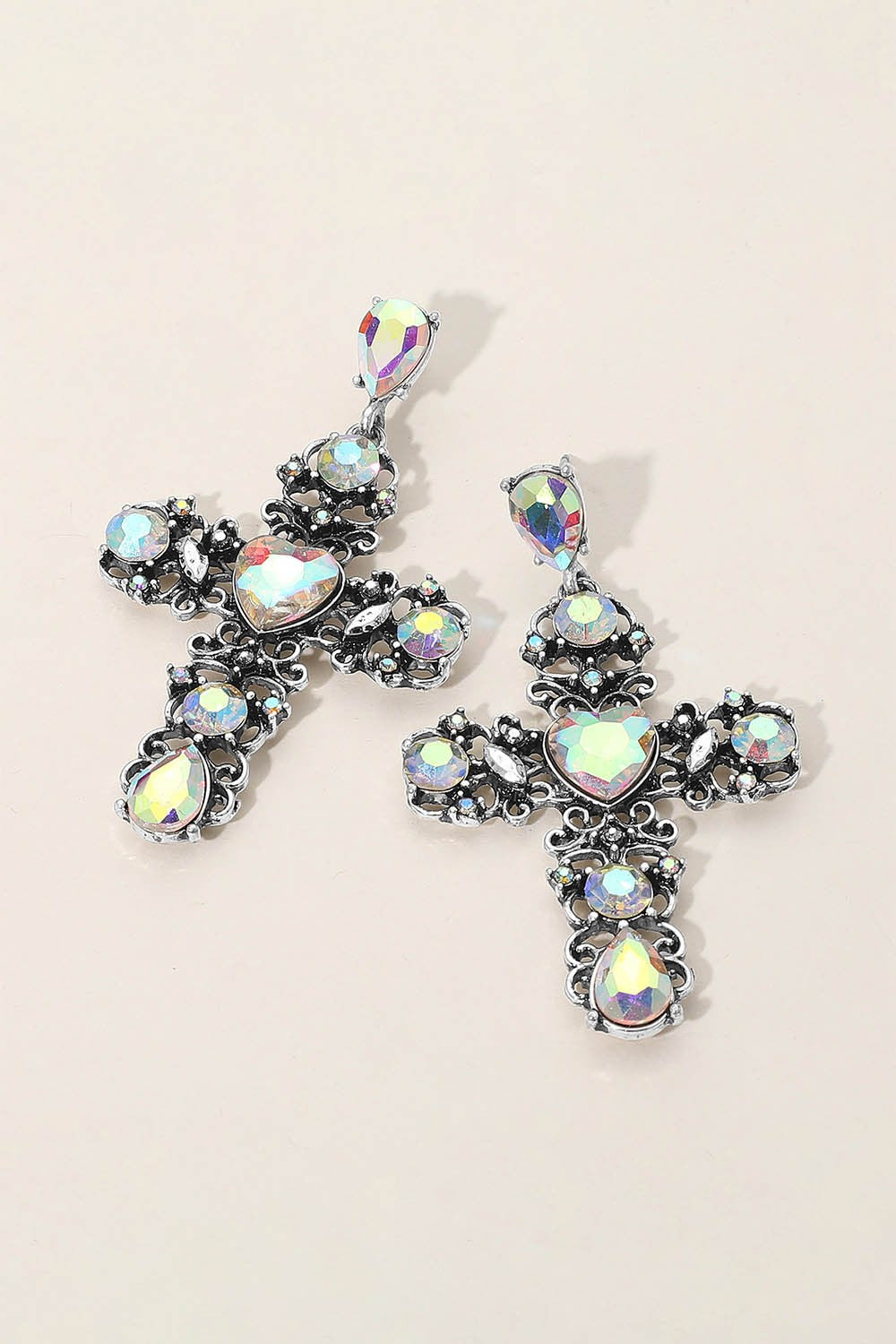 Size : 1.5" X 2.5" Post Back Add bold elegance to your look with these ornate cross drop earrings featuring intricate filigree detailing and radiant jewels. Perfect for formal wear or evening events, they deliver a vintage-inspired flair with eye-catching brilliance. Lead and Nickel Compliant Iridescent Heart Stone Centered Ornate Cross Dangle Earrings