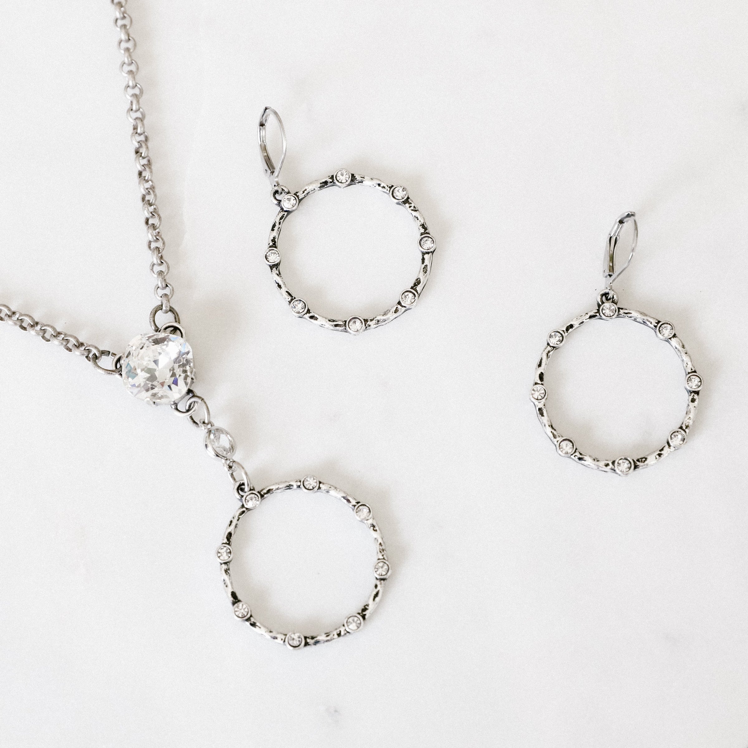 Crafted with a leverback setting, these hoop earrings are embellished with crystals for a touch of elegance. Pictured with the Seville Necklace.