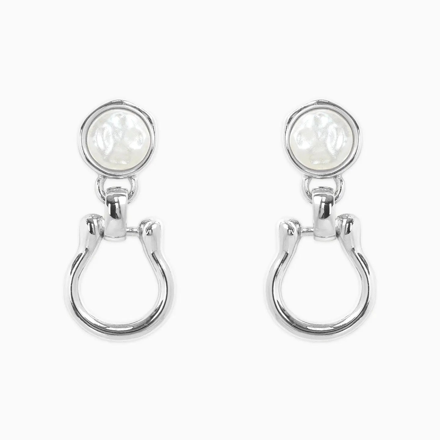 A statement pearl sits at the top, connected to a polished horsebit drop. Material: Zinc, Resin, Steel Size: 17**37mm, 10mm
