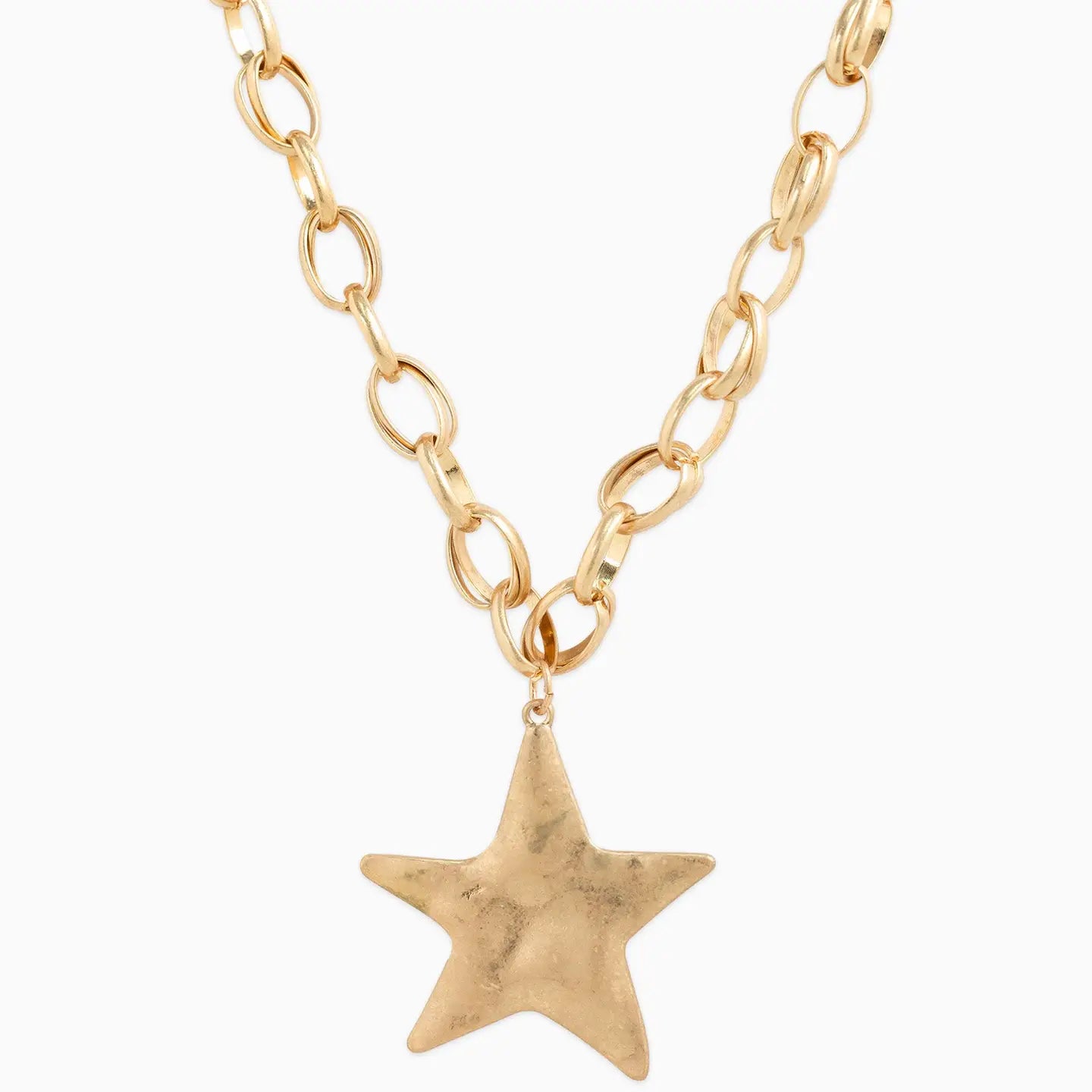 A bold, hammered oversized star pendant in a worn gold finish, delivering a cool, trend-forward silhouette with a vintage-inspired edge. Material: Zinc, Steel Size: 16+3"