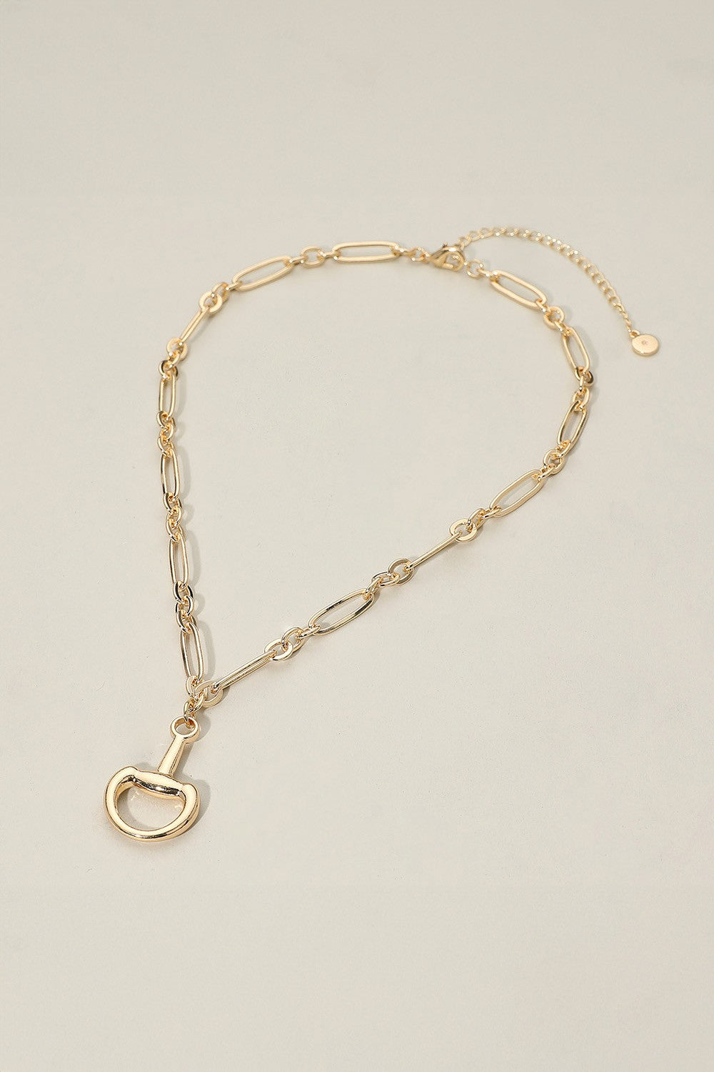 Necklace Size : 16" + 3" L Pendant Size : 0.8" X 1.25" Sleek chain necklace featuring an elegant half horsebit accent for a contemporary, minimalist look. Designed for versatile styling with both casual and elevated outfits, this statement accessory adds subtle edge and sophistication, making it a perfect go-to piece or a thoughtful gift choice. Lead and Nickel Compliant Half Horsebit Pendant Metal Chain Necklace