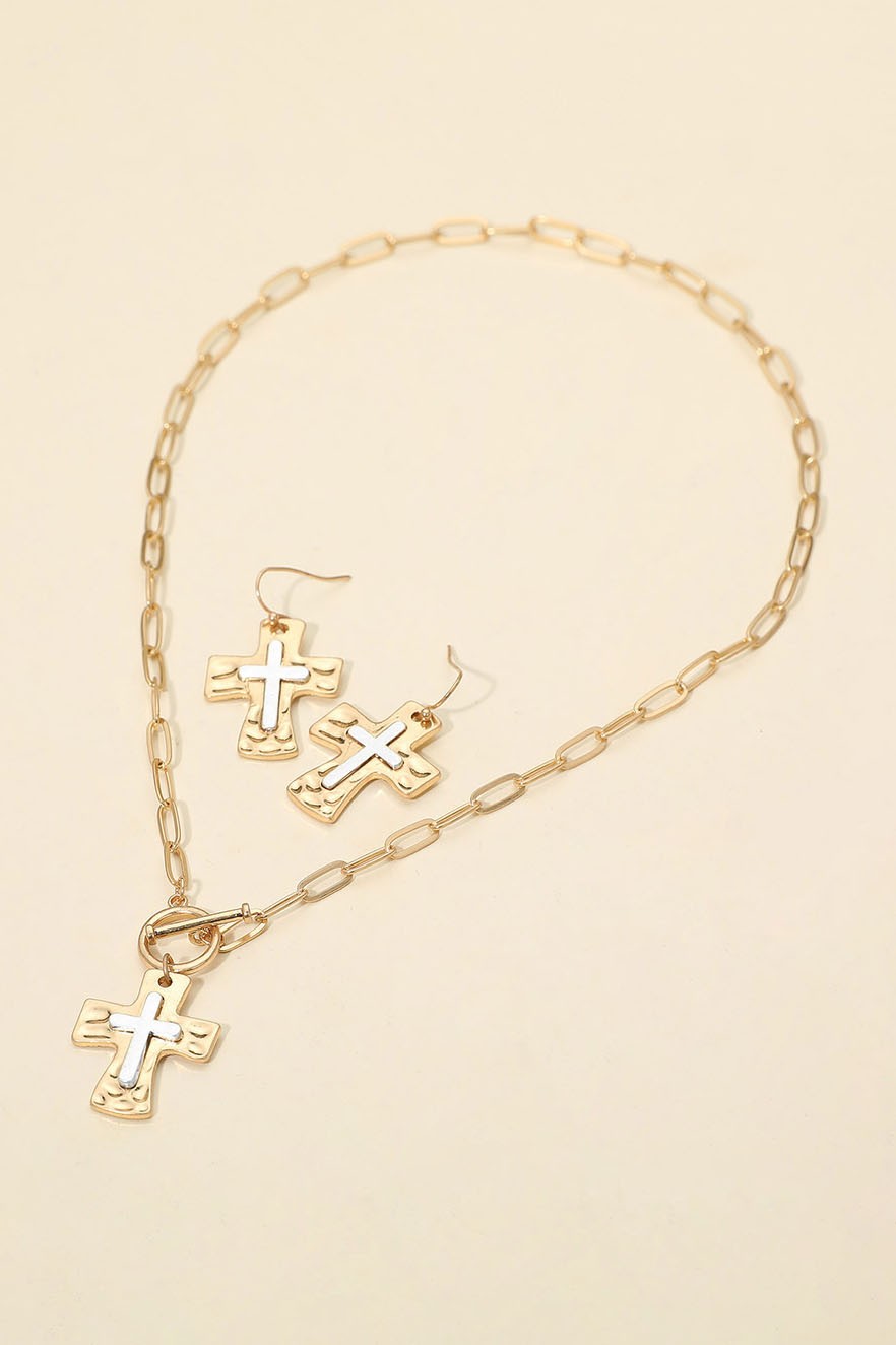 Necklace Size : 18.5" L Pendant Size : 1" X 1.2" Earrings Size : 1.5" L Toggle Closure This elegant jewelry set includes a link chain necklace with a cross pendant and matching drop earrings. The hammered detailing enhances its unique charm, making it a versatile accessory for casual wear or special occasions, adding a stylish and meaningful touch to your look. Lead and Nickel Compliant Brushed Hammered Metal Cross Pendant Paperclip Chain Toggle Necklace