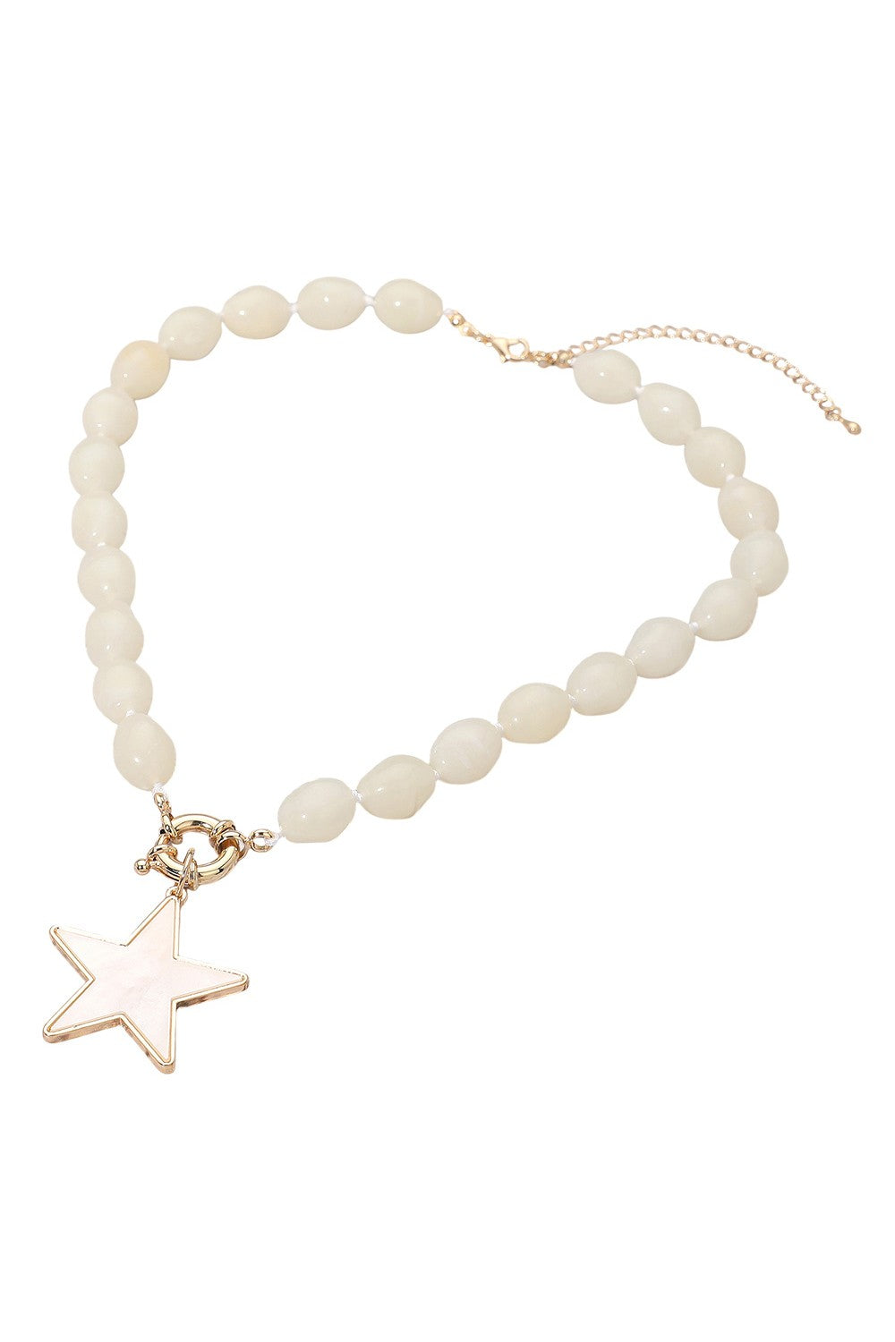 Necklace Size : 16.5" + 3.5" L Decor Size : 2" L Stylish beaded necklace featuring smooth rounded beads and a radiant star pendant for a chic and modern touch. Perfect for layering or wearing solo, adding effortless charm to any outfit. A versatile accessory that blends playful elegance with contemporary design. Lead and Nickel Compliant Mother of Pearl Star Pendant Marbled Pebble Beaded Necklace