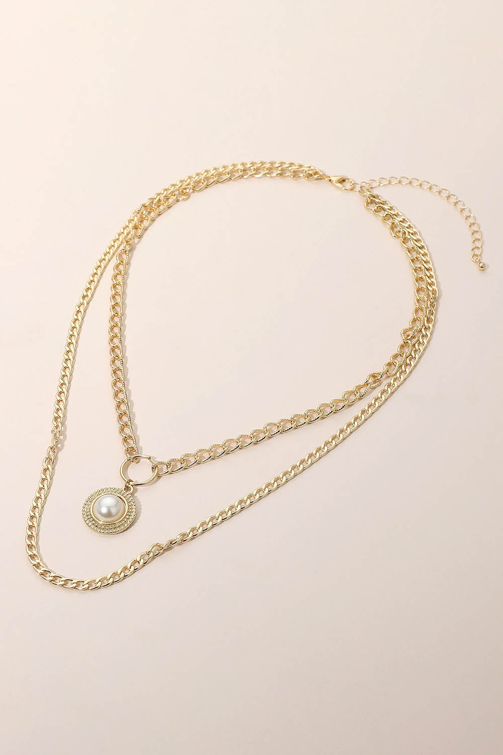 Necklace Size : 16" + 3" L Decor Size : 1.5" L Pendant Size : 0.7" X 1.25" Modern layered chain necklace featuring bold links and a pearl-inspired pendant framed with sparkling accents. A chic statement piece that blends elegance with trend-forward design, perfect for elevating everyday outfits or enhancing special occasion looks with timeless charm. Lead and Nickel Compliant Pearl Pendant Accent Layered Chain Necklace