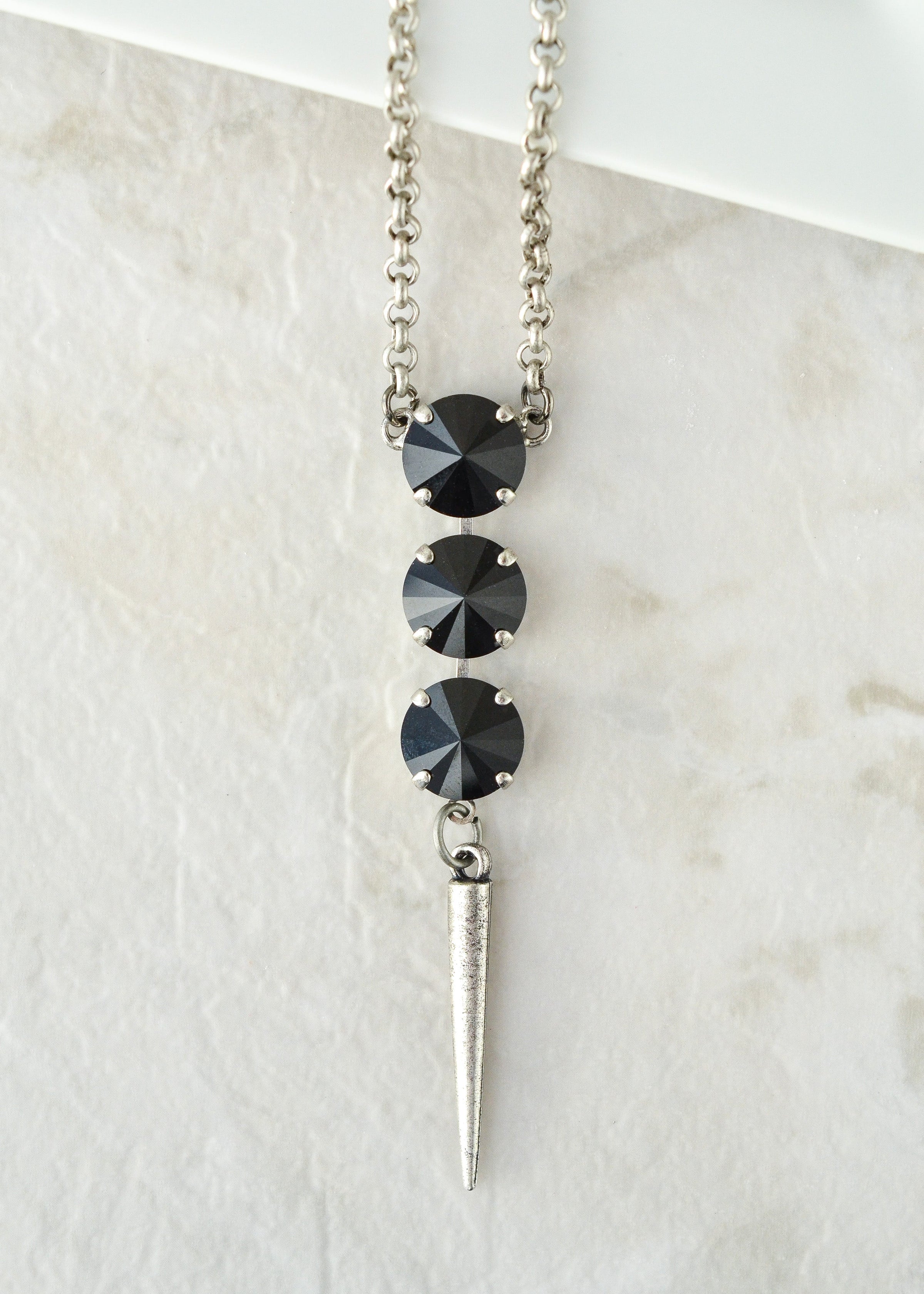 Edgy Glam. This necklace coordinates with the Gabby spike earring and is available in all of your favorite colors. The length is 28" and has a 3-stone pendant with a spike drop.