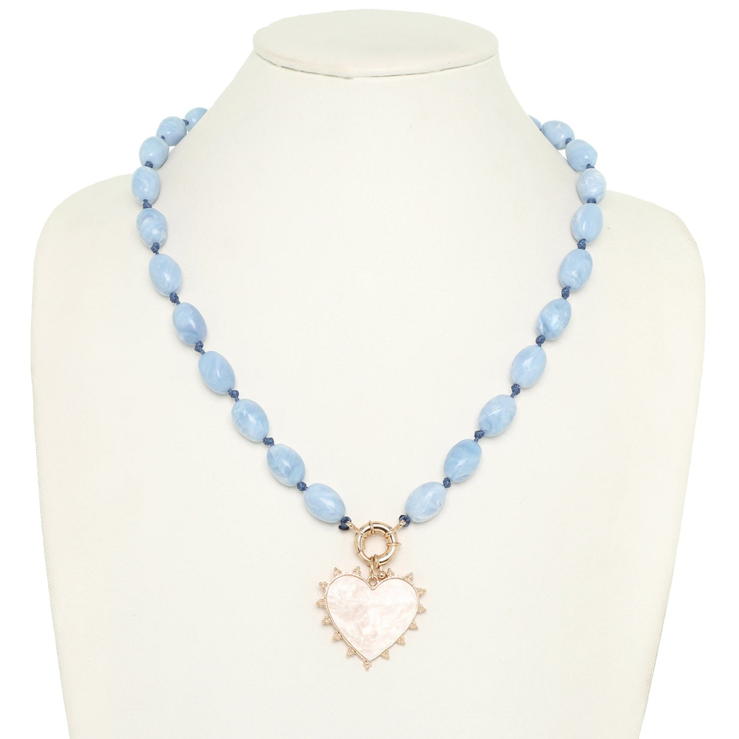 Necklace Size : 20.5" + 4" L Decor Size : 1.75" L Elegant beaded necklace designed with marbled beads and a statement heart pendant charm. A fashionable accessory perfect for everyday wear or special occasions, adding romantic charm and a unique finishing touch. Lead and Nickel Compliant Mother of Pearl Heart Pendant Marbled Resin Oval Beaded Necklace
