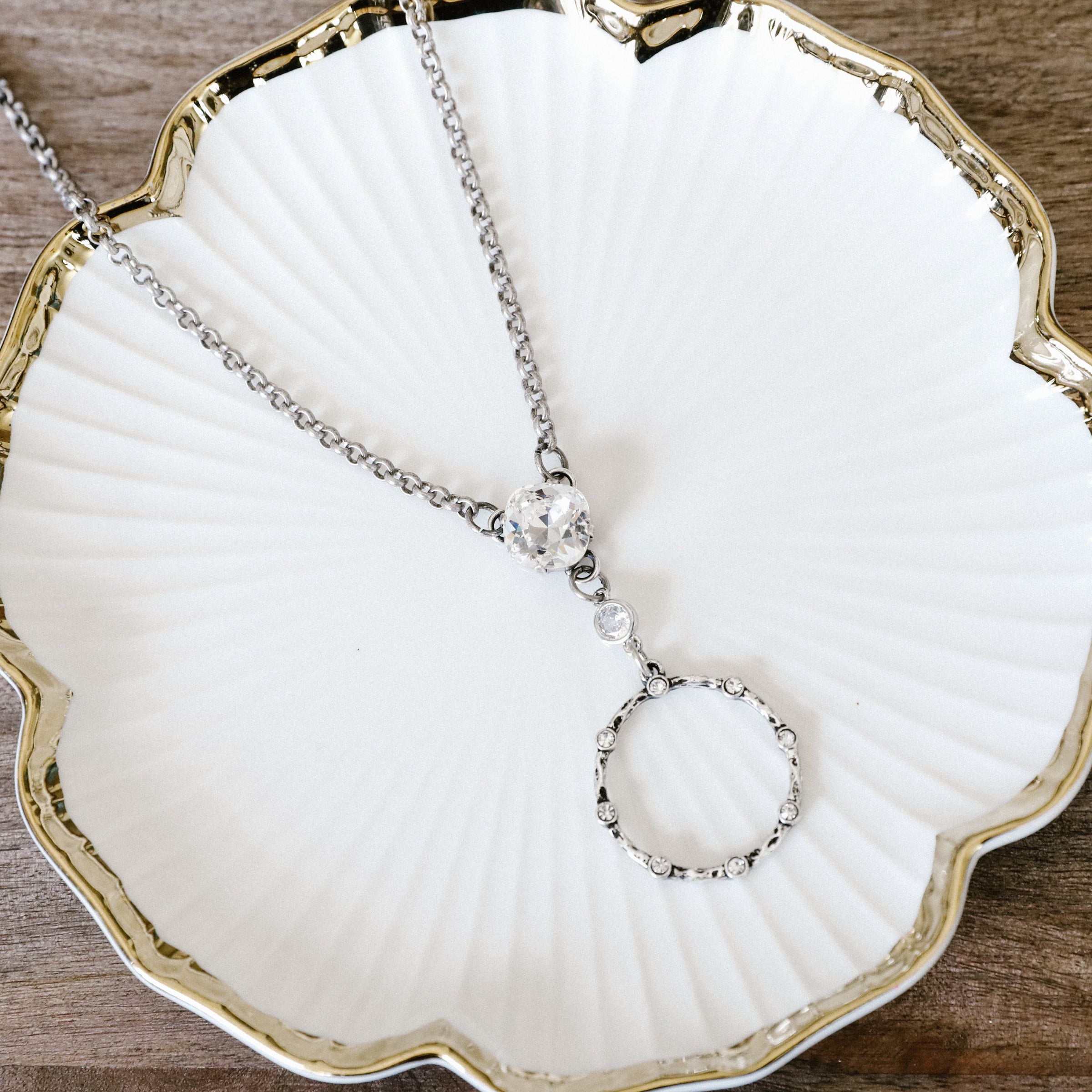 The Seville Necklace features a cushion-cut crystal with a crystal-embellished hoop pendant for an elegant and stylish addition to any outfit.