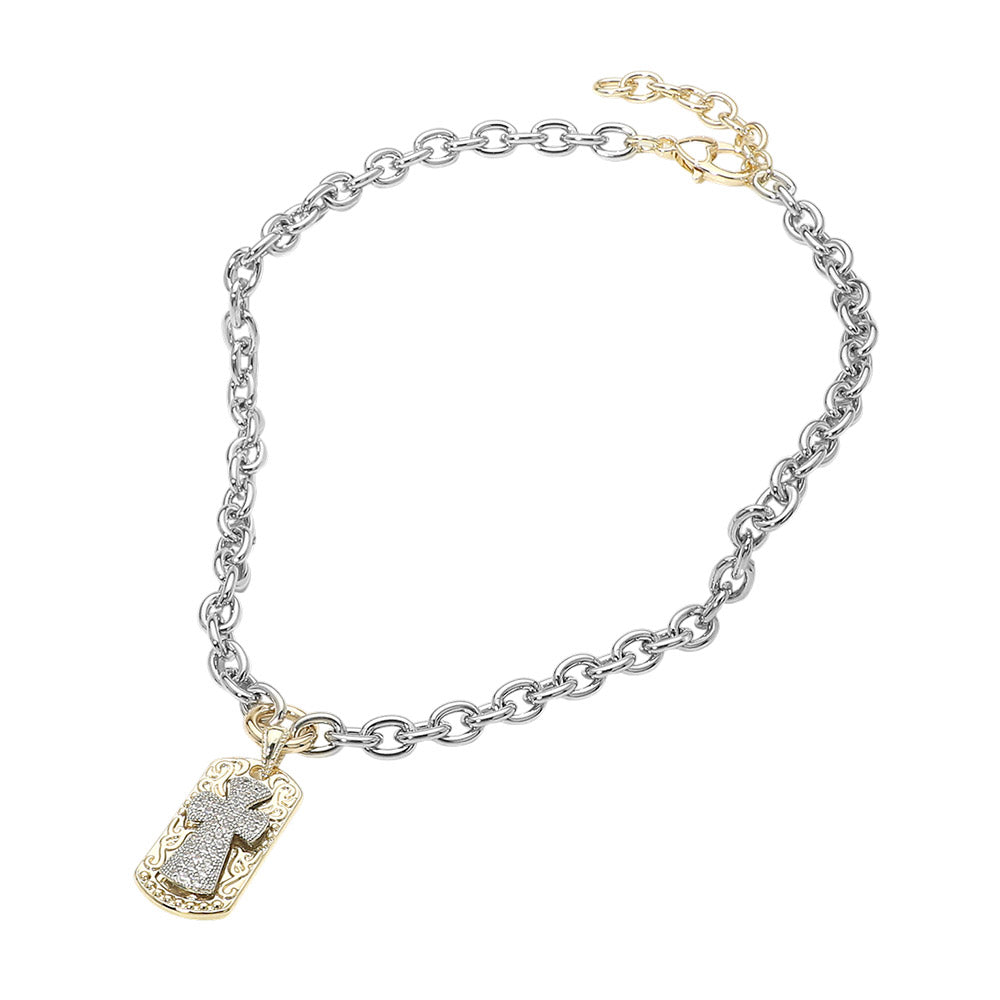 • Modern two tone chain necklace featuring a decorative tag pendant accented with a cross and pavé detailing for refined brilliance. Designed with classic round links and an adjustable closure, this statement piece blends bold structure with timeless symbolism for versatile everyday